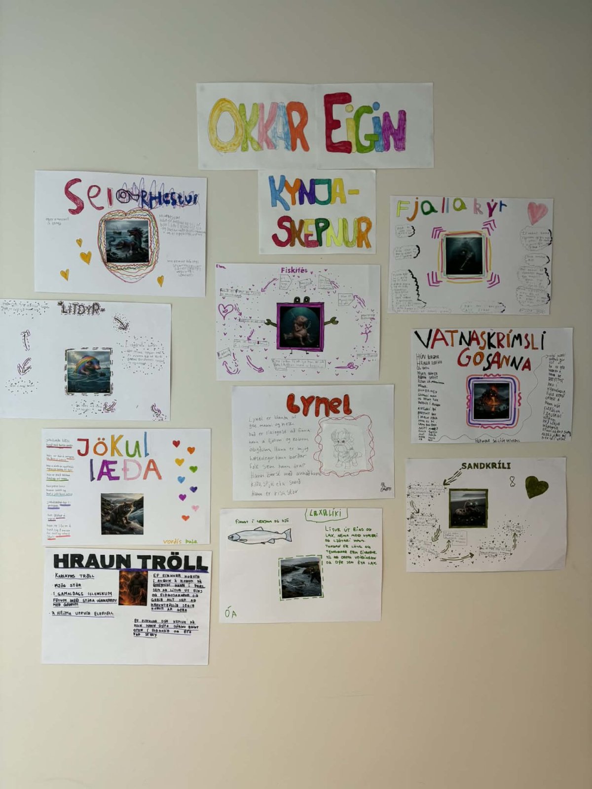 Síðan fengum við að búa til okkar eigin kynjaskepnu. Við skrifuðum fyrst allt um skepnurnar og síðan bjuggum við til myndir af þeim og settum á plakat. Sumir teiknuðu myndirnar og sumir notuðu gervigreind til að búa þær til. Það urðu til allskonar skepnur og plakötin eru litrík og flott. Skepnurnar eru mjög fjölbreyttar og ólíkar. Sumar eru skrítnar, sumar hræðilegar og svo eru þær bæði stórar og litlar.