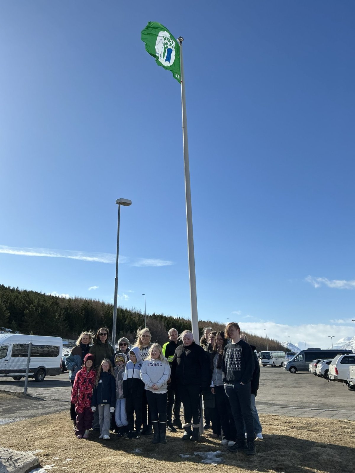 Allir bekkir eiga fulltrúa í umhverfisráði og auk ofangreindra eiga þar sæti Tíbrá 1. b., Indíana 2. b., Sóley 5. b., Agnes 6. b. og Aylin 9. b. Úr hópi starfsfólki skólans eru auk Önnu Rósar, Gulla, Begga, Ólöf og Arna. Hér má sjá myndir frá afhendingunni í dag þar sem umhverfisnefnd skólans veitti fánanum viðtöku.